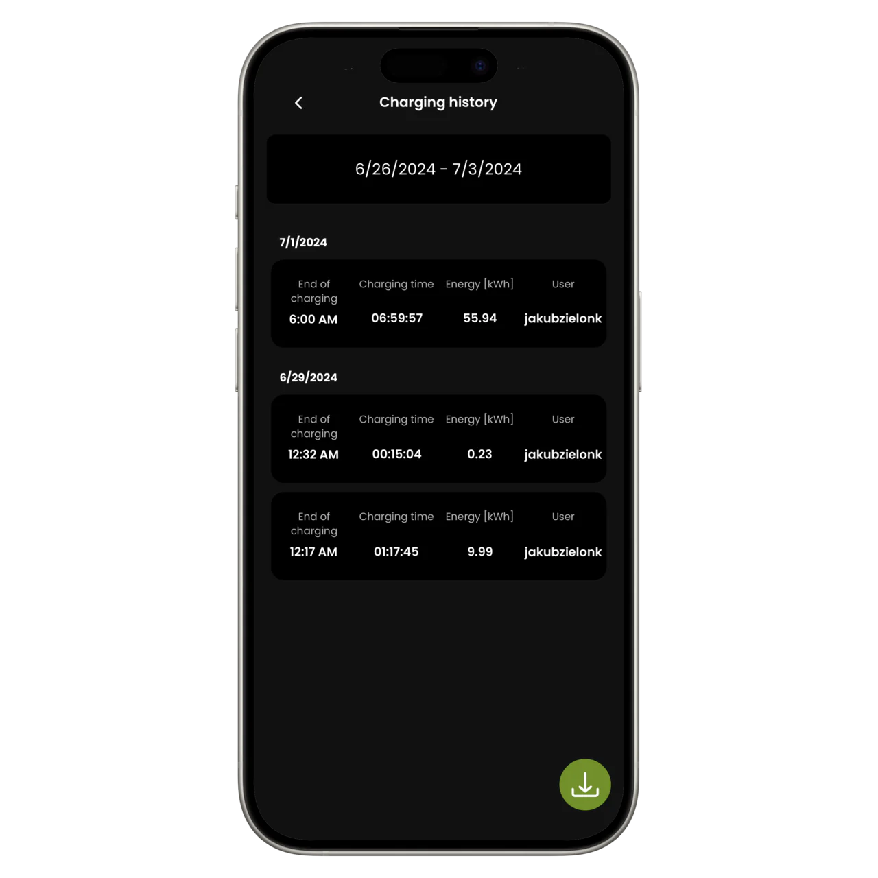 Vous pouvez afficher et analyser chaque session de recharge : la quantité d'électricité consommée, la durée de la recharge et le nom de la personne qui a autorisé la session. Vous pouvez télécharger l'historique des recharges au format CSV.