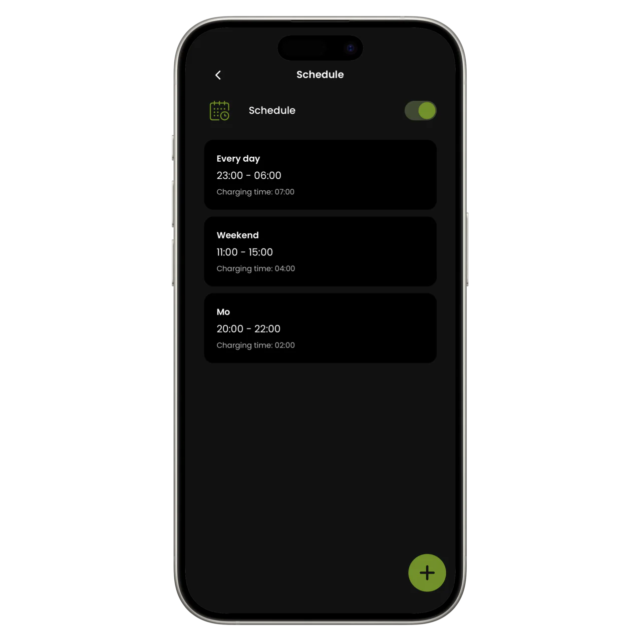 Rechargez votre voiture selon un horaire fixe, par exemple lorsque le tarif est plus avantageux ou lorsque les panneaux photovoltaïques produisent de l'énergie. Fixez un moment qui vous convient : un jour ou même une heure.