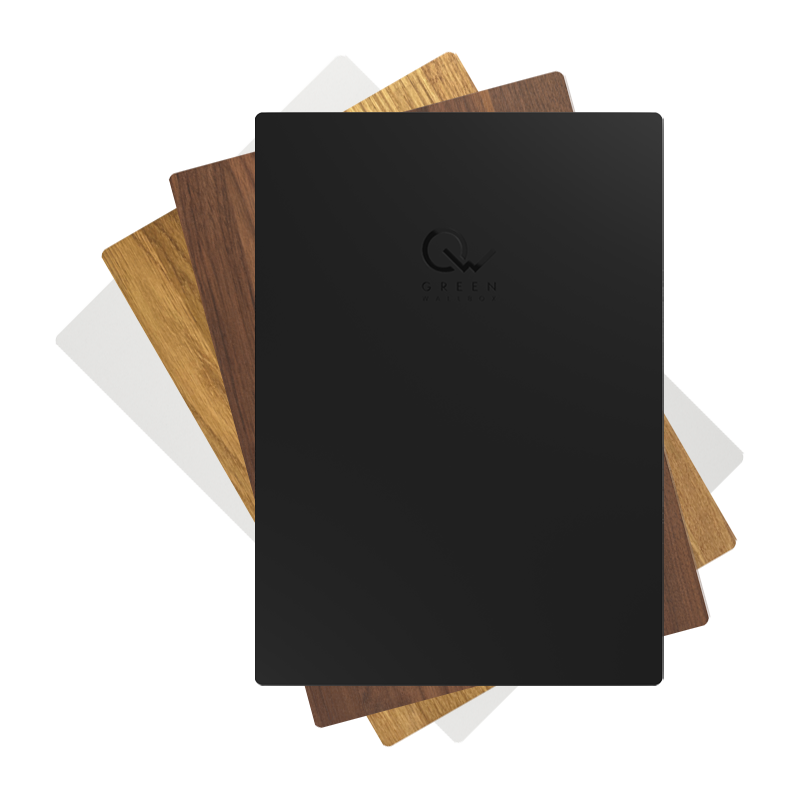 En version standard, Green Wallbox 2 Pro Slim et Max sont équipés d'un panneau frontal noire en verre mat. Des panneaux frontaux remplaçable conçus à partir des matériaux naturels tels que le bois ou la pierre sont également accessibles.