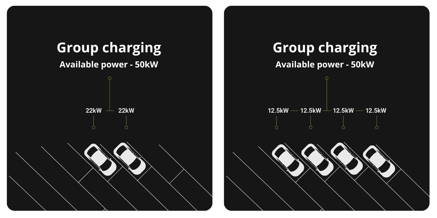 Le group charging gère la puissance disponible et la distribue aux appareils individuels qui effectuent une session de chargement active du véhicule. La valeur de recharge varie en fonction du nombre de voitures branchées.
